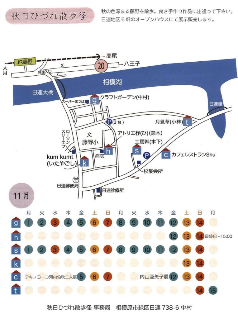 秋日ひづれ散歩径 秋の色深まる藤野を散歩。 日連地区6軒のオープンハウスにて展示販売が行われます。 Bee simpleは 11月13日14日の2日間、K :kum Kumt (緑区日連572−6)にて展示されています。 秋日ひづれ散歩径FBページ